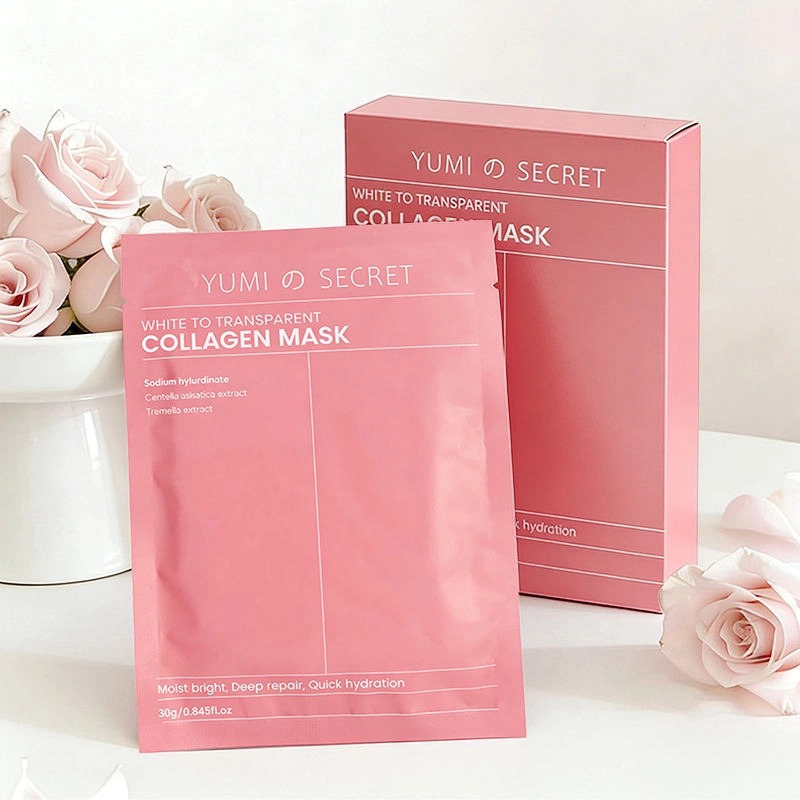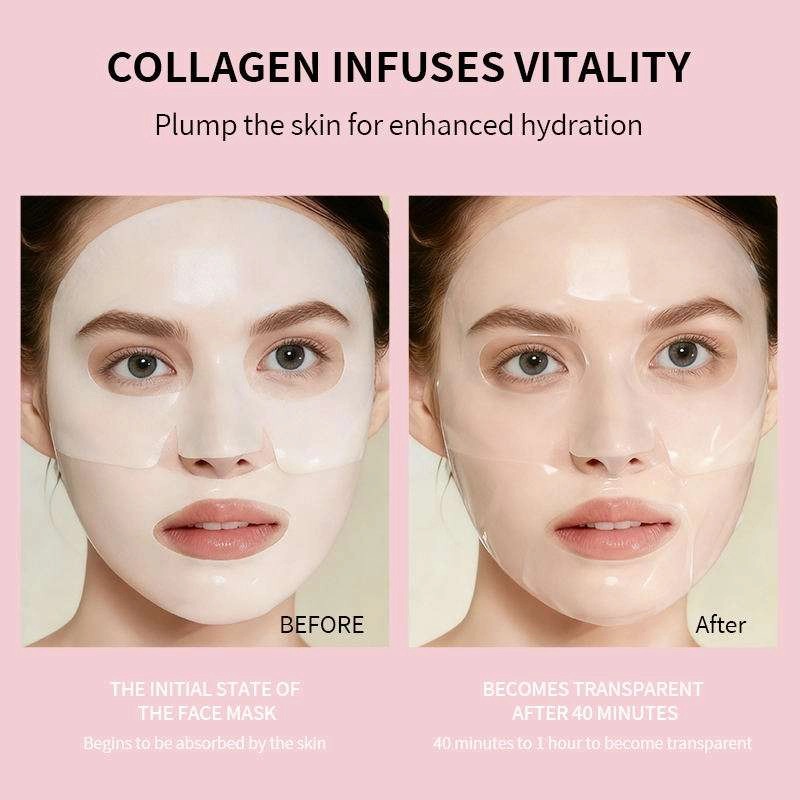 마스크는 처음에는 흰색이었다가 40~60분 후 점차 투명해지는데, 이는 콜라겐 에센스가 피부에 완전히 흡수되어 집중적인 영양을 공급하고 있음을 나타냅니다.