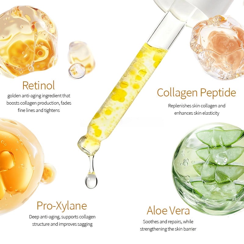 ⇒ 레티놀: 콜라겐 생성을 촉진하고 잔주름을 완화하며 처진 피부를 탄력 있게 가꿔주는 대표적인 노화 방지 성분입니다.